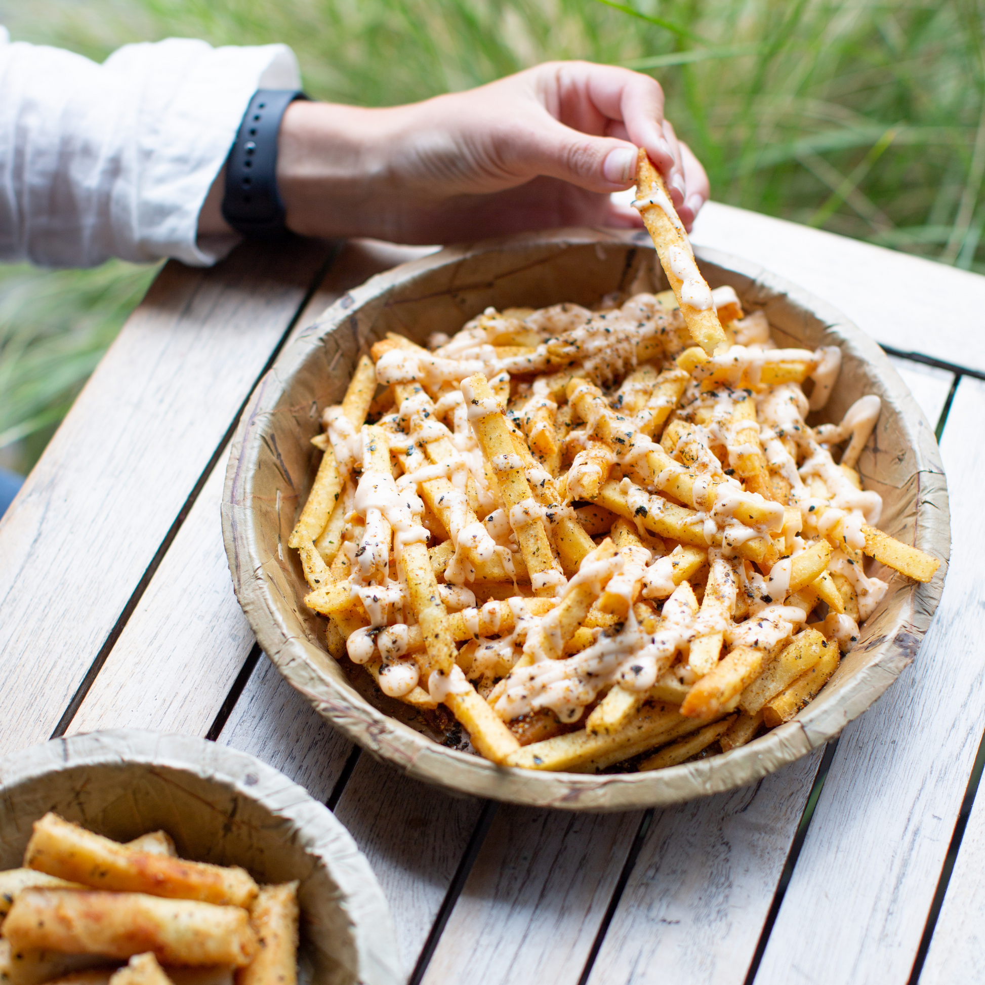 These biodegradable plates combine durability with eco-friendly elegance, making them a sustainable choice for vibrant, multi-component meals.